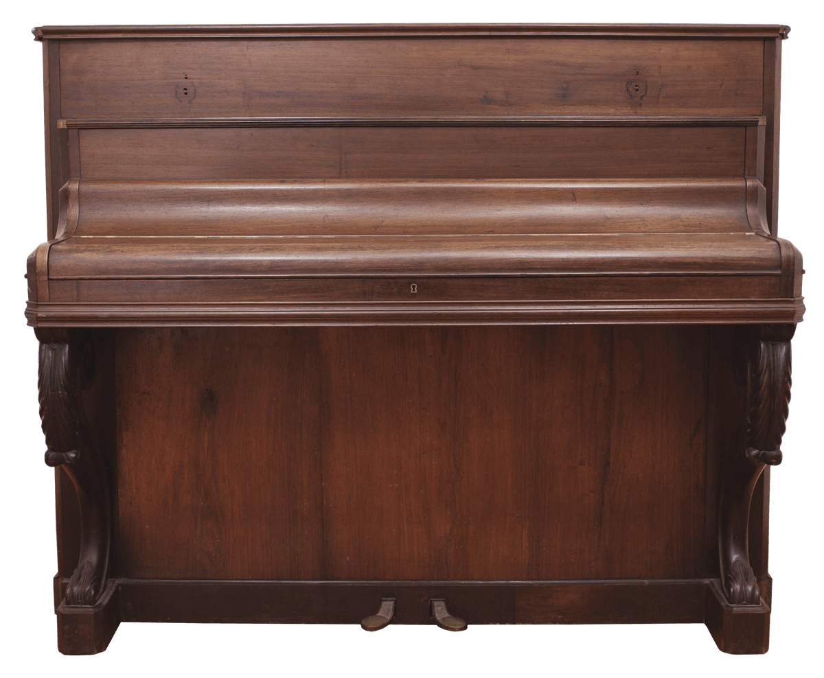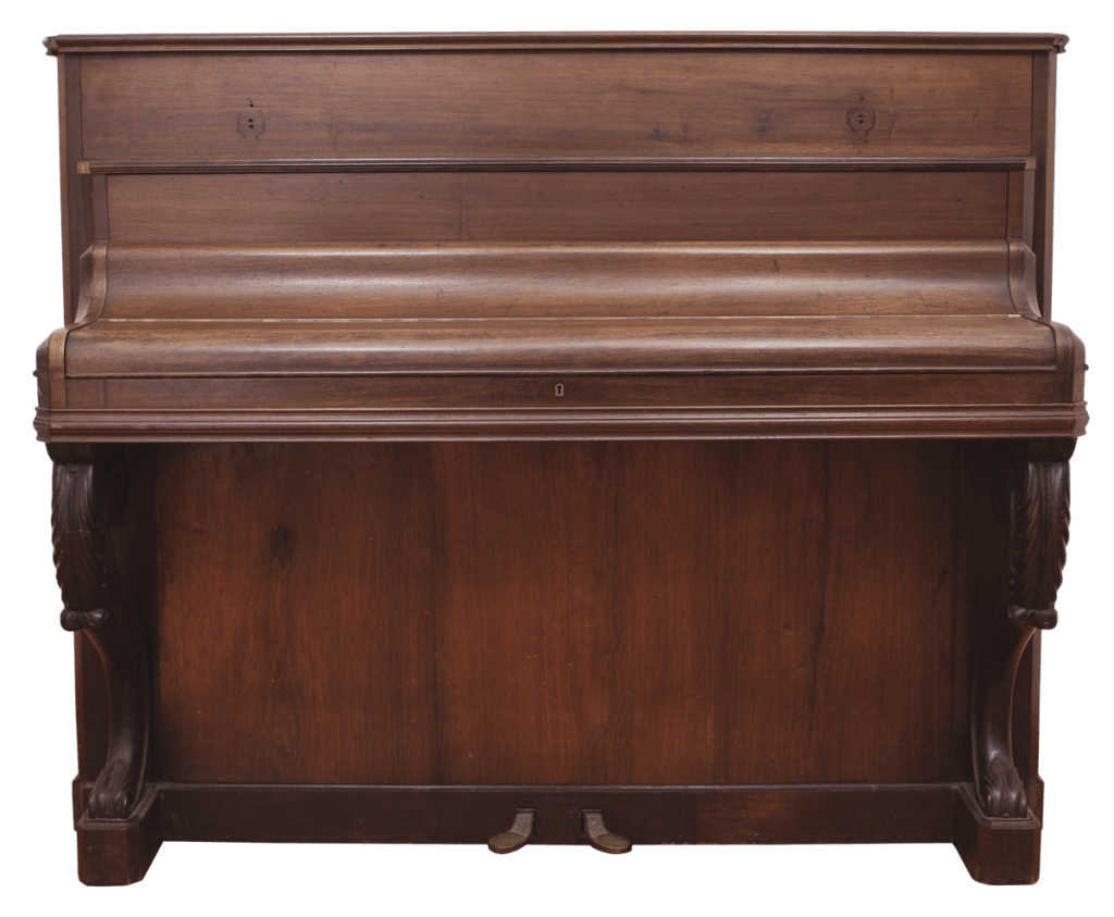 fornirowane palisandrem; podpory stołu klawiaturowego esowate, zakończone wolutami i ozdobione liśćmi akantu, 2 świeczniki, okleina klawiatury – kość słoniowa, półtony czarno barwione.