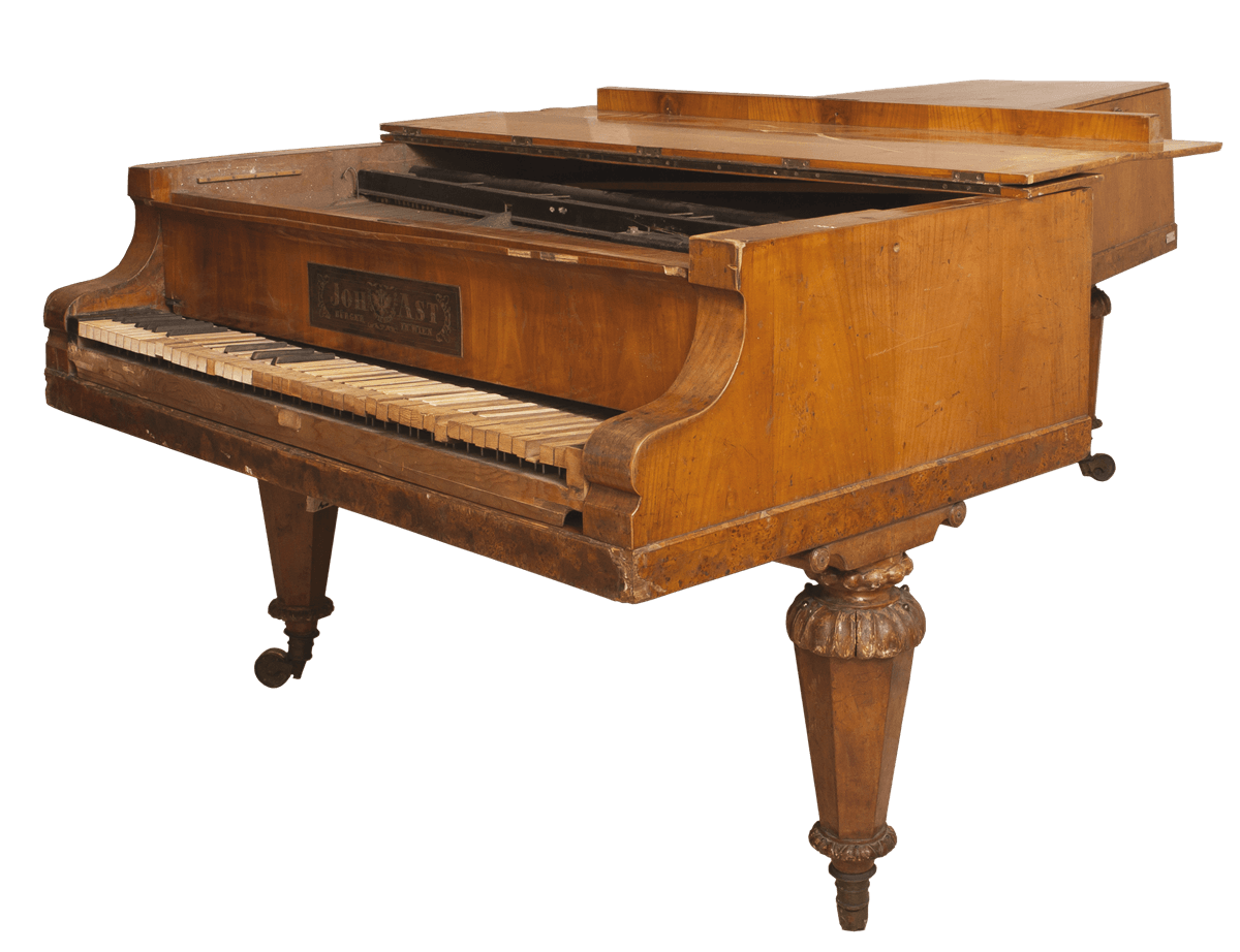 fornirowany jesionem, nogi 6-kątne, zawieszenie pedału w kształcie liry z pionowymi żyłkami z jasnego drewna, pulpit ramkowy, okleina klawiatury – kość słoniowa, heban / czarno barwione drewno.