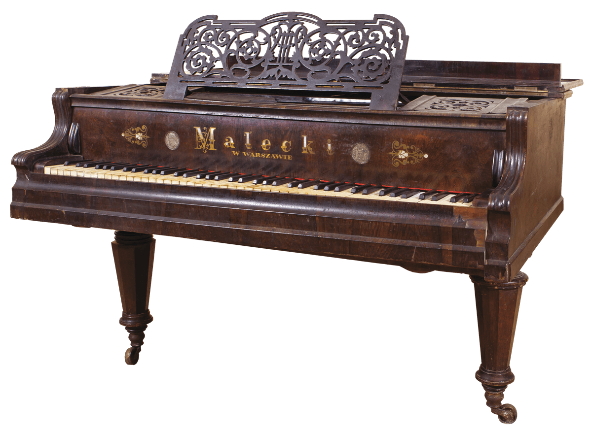 na pokrywie klawiatury inkrustowany mosiądzem i masą perłową, ozdobiony ornamentem roślinnym napis: małecki / w warszawie; oraz medalowe plakietki z wystawy paryż 1867, awers z głową cesarza i napisem: napoleon iii empereur / z. münchheimer f. [fecit, – karol zygmunt münchheimer, warszawski medalier], rewers z wizerunkiem orła, wieńca laurowego i amorkami trzymającymi tablicę z napisem: j. małecki, oraz: exposition universelle de mdccclxvii a paris / z. müncheimer f.; na prawym boku od wewnątrz drukowana, papierowa wklejka reklamowa (brak) z wizerunkami medali paryż 1867 i wiedeń 1873: fabryka fortepianów / małeckiego / w warszawie / na sewerynowie no 2779 / przy ulicy aleksandrya; na ramce klinowej klawiatury ołówkiem: 845; na ramie tłumików od spodu ołówkiem: no 875 t [?] w.