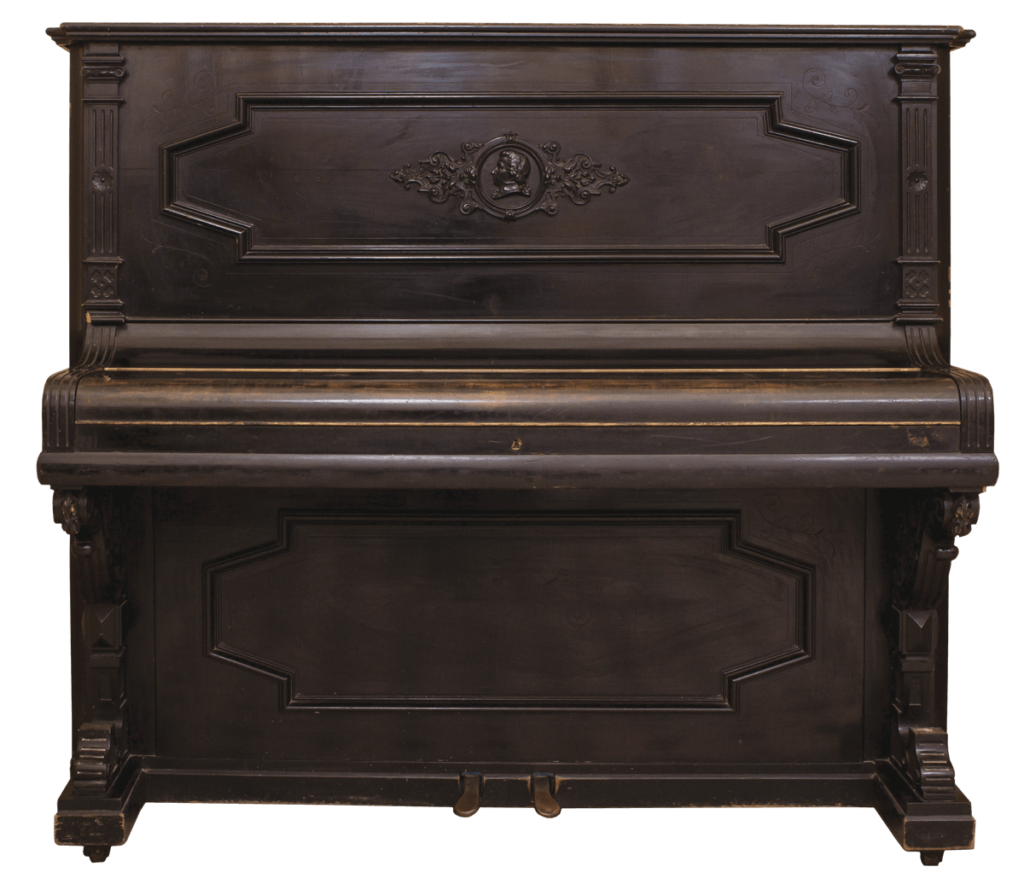czarno lakierowane, w stylu eklektycznym, bogato zdobione żłobieniami (secesyjny motyw na drzwiach dolnych), sterczynami, głową mozarta na drzwiach górnych. klawiatura – kość słoniowa, półtony czarno barwione.