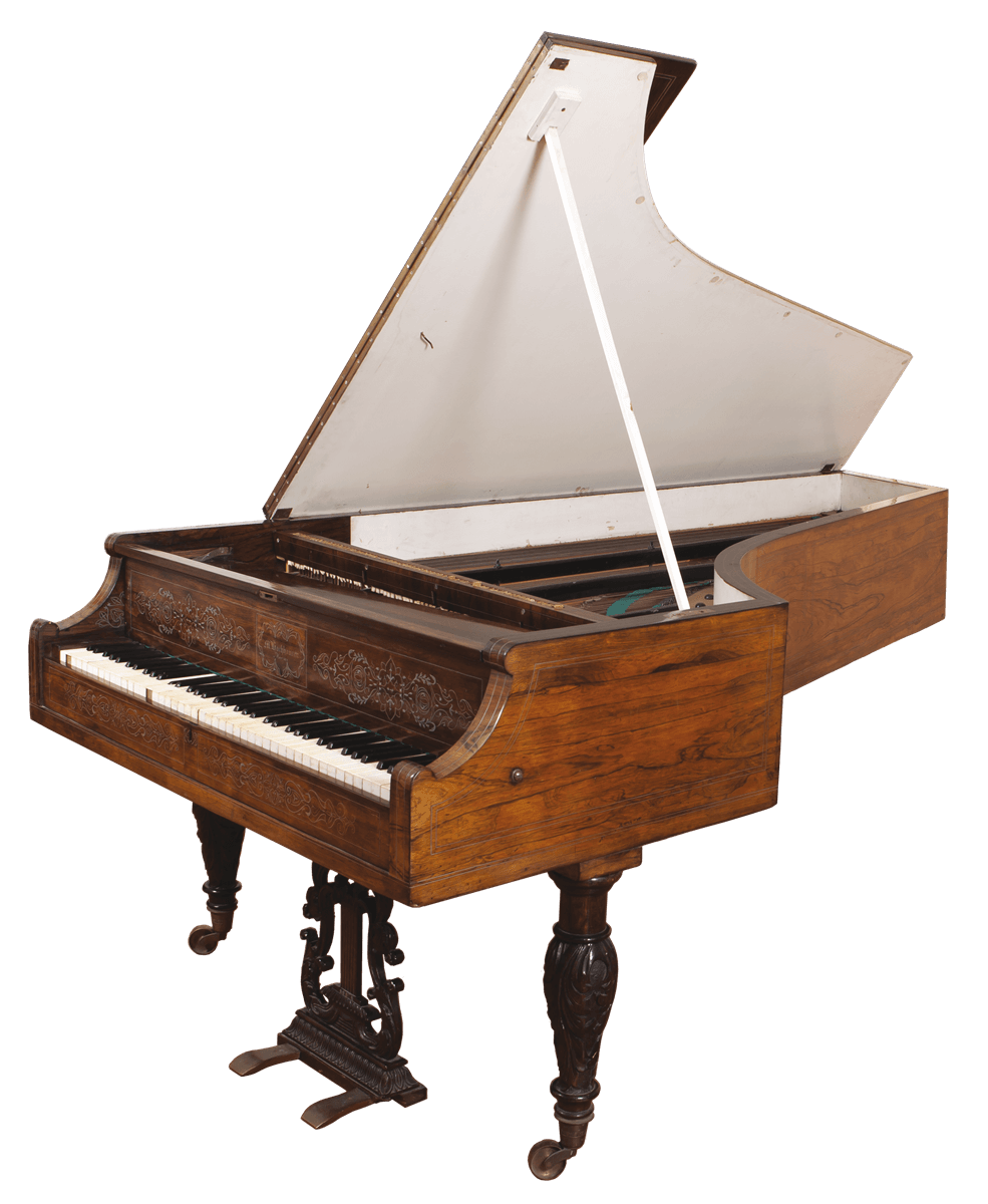 fornirowany palisandrem, cała skrzynia wraz z pokrywami bogato inkrustowana cyną w ornamenty geometryczno-roślinne, nogi toczone i profilowane, rzeźbione w liść akantu, zawieszenie pedału w kształcie liry rzeźbionej w liść akantu, pulpit ramkowy, okleina klawiatury – kość słoniowa, heban / czarno barwione drewno.