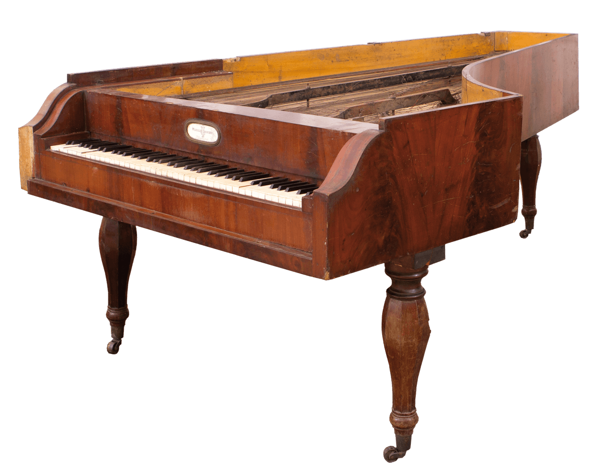 nad klawiaturą owalna drukowana papierowa tabliczka z wizerunkiem liry połączonej z dzwonem i głową apollina, ozdobiona ornamentem roślinnym, w ramce z brązu złoconego, pod szkłem: wilhelm troschel / w / warszawie.