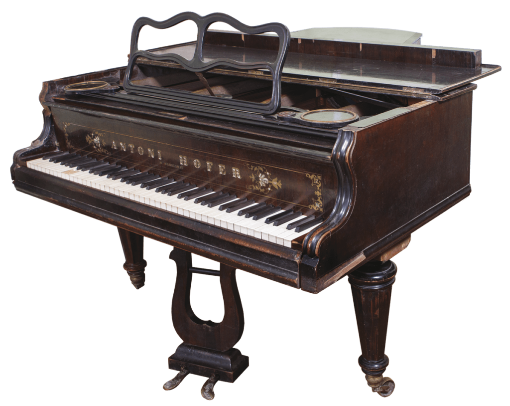 na pokrywie klawiatury inkrustowany mosiądzem i masą perłową, ozdobiony ornamentem roślinnym napis: antoni hofer / w warszawie; na strojnicy wytłoczona owalna pieczęć: fabryka fortepianów / antoniego / hofer / w warszawie / 2593; na płycie rezonansowej kalkomania z wizerunkami medali petersburg 1870 i wiedeń 1873, orłem cesarskim i napisem w jęz. rosyjskim i polskim: list pochwalny 1857 / antoni hofer / w warszawie; na ramie klawiatury wpisy ołówkiem: dn. 13.8.1879 seweryn dąbrowski / d. 19/i 1900 franciszek smolarkiewicz z kalisza.