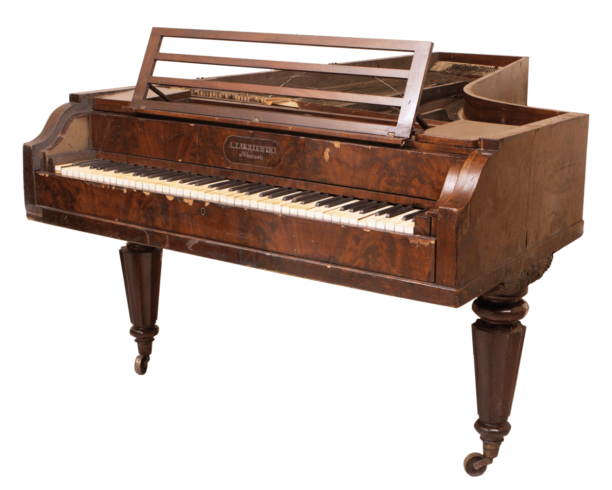 fornirowany orzechem; nogi 10-kątne, kostki nóg rzeźbione w liść akantu, zawieszenie pedału w kształcie liry, pulpit ramkowy, okleina klawiatury – kość słoniowa, heban / czarno barwione drewno.