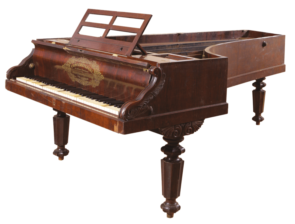 fornirowany orzechem; nogi 8-kątne, boczki i fartuszki nóg rzeźbione w liść akantu, zawieszenie pedału w kształcie liry, pulpit ramkowy, okleina klawiatury – kość słoniowa, heban / czarno barwione drewno.