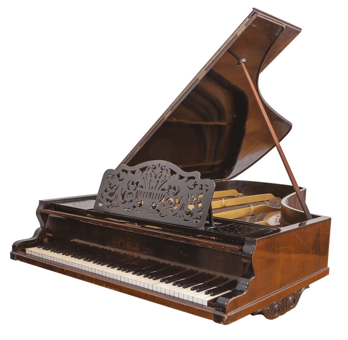 fornirowany palisandrem, nogi 8-kątne rzeźbione w liść akantu, zawieszenie pedału w kształcie liry, pulpit ażurowy o motywach geometryczno–roślinnych, okleina klawiatury – kość słoniowa, heban / czarno barwione drewno.
