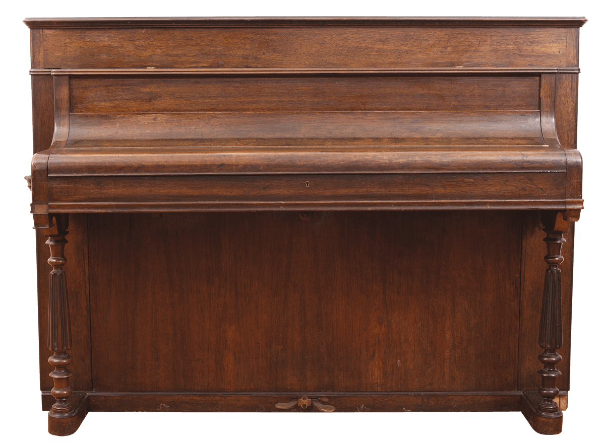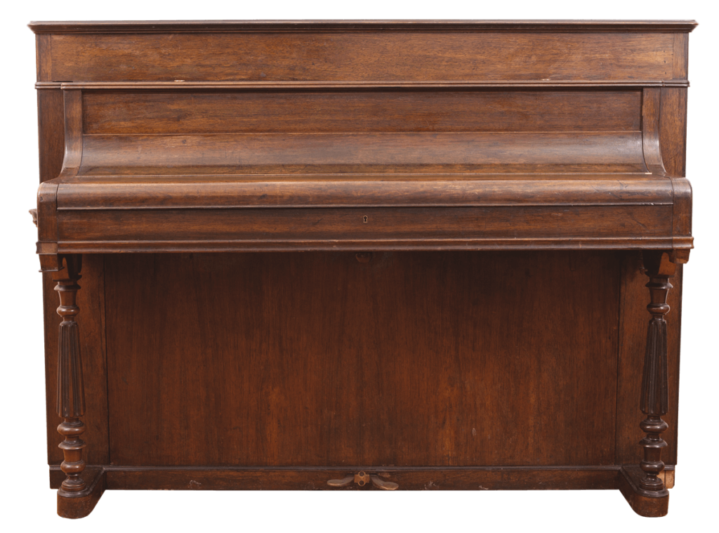 fornirowane palisandrem; podpory pionowe stołu klawiaturowego w formie filarków toczonych kanelowanych, u góry i dołu profilowanych, pulpit ramkowy składany, na bokach antaby z brązu, okleina klawiatury – kość słoniowa, heban / czarno barwione drewno.