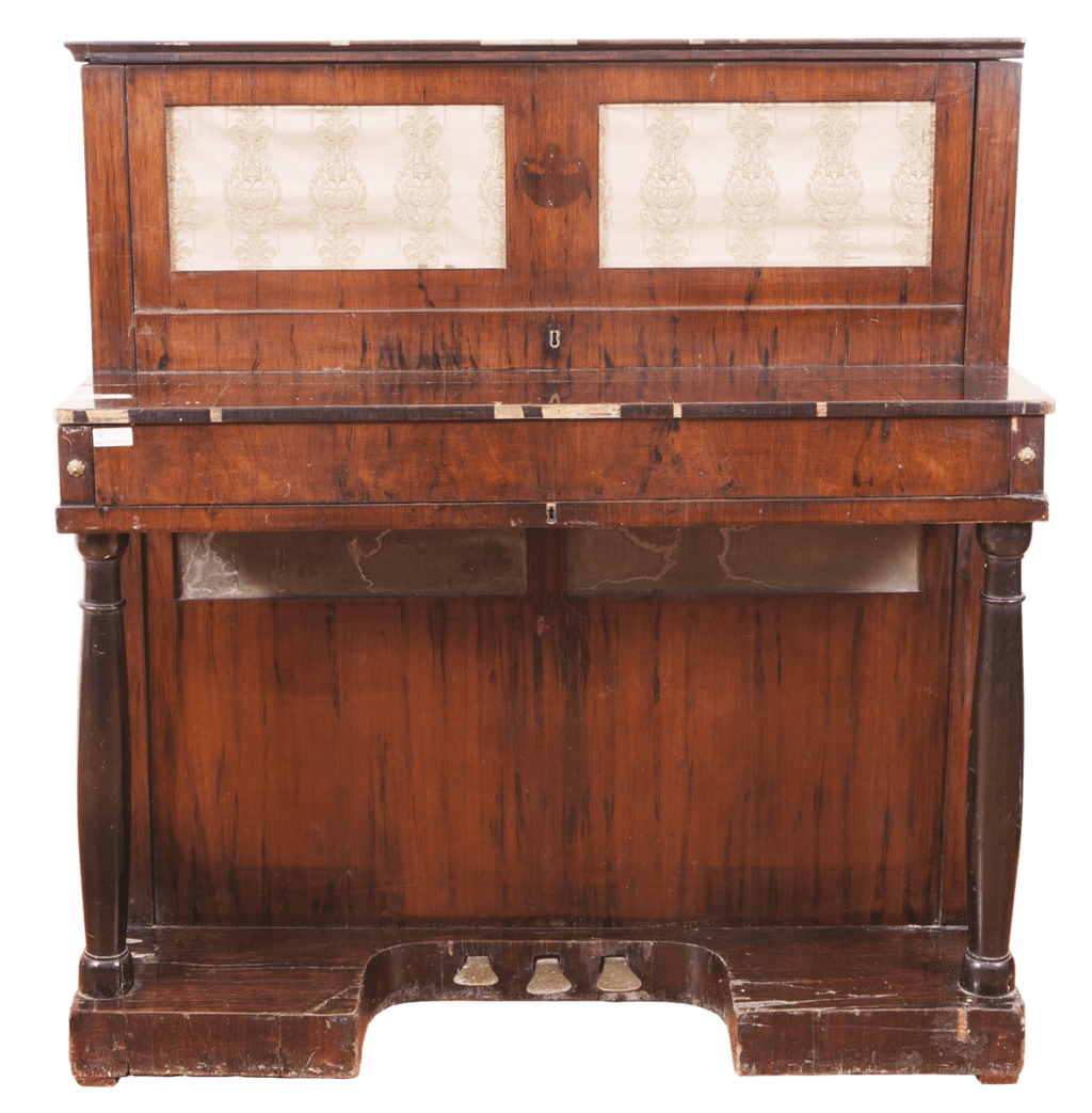 fornirowane palisandrem; drzwi górne z dwiema prostokątnymi płycinami wypełnionymi jedwabiem, pomiędzy płycinami tabliczka firmowa, drzwi dolne z 2 prostokątnymi płycinami wypełnionymi metalizowaną siatką, podpory pionowe stołu klawiaturowego w kształcie toczonych filarków, podpora pozioma z owalnym wycięciem, na boczkach od przodu rozety z brązu, u góry ruchome świeczniki z brązu, okleina klawiatury – kość słoniowa, heban / czarno barwione drewno.