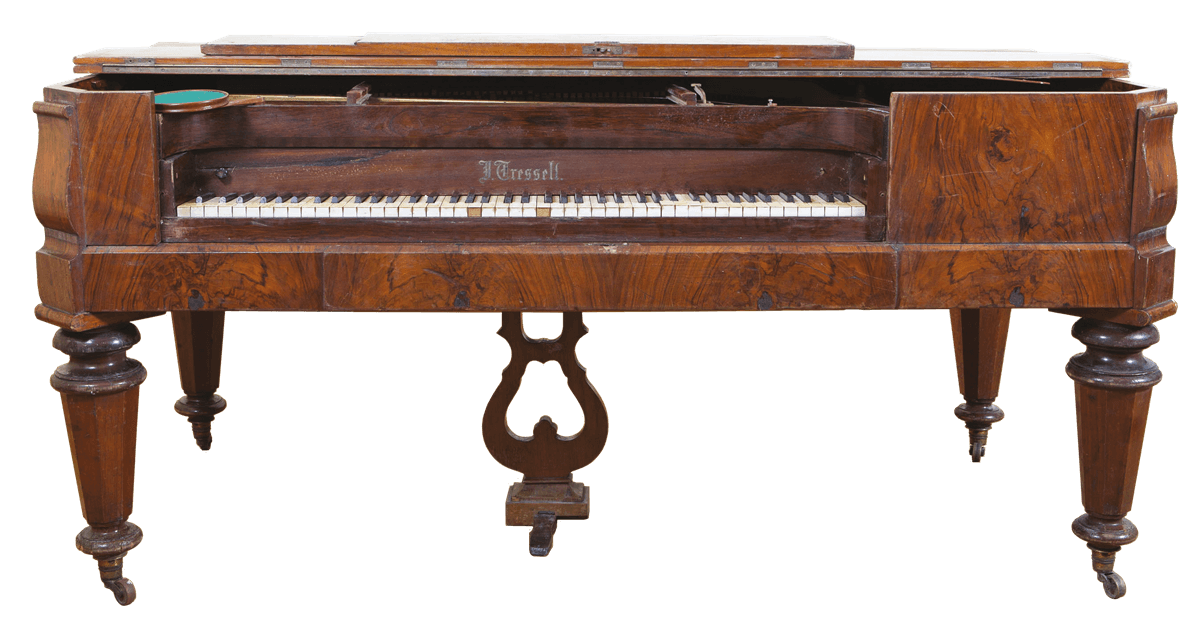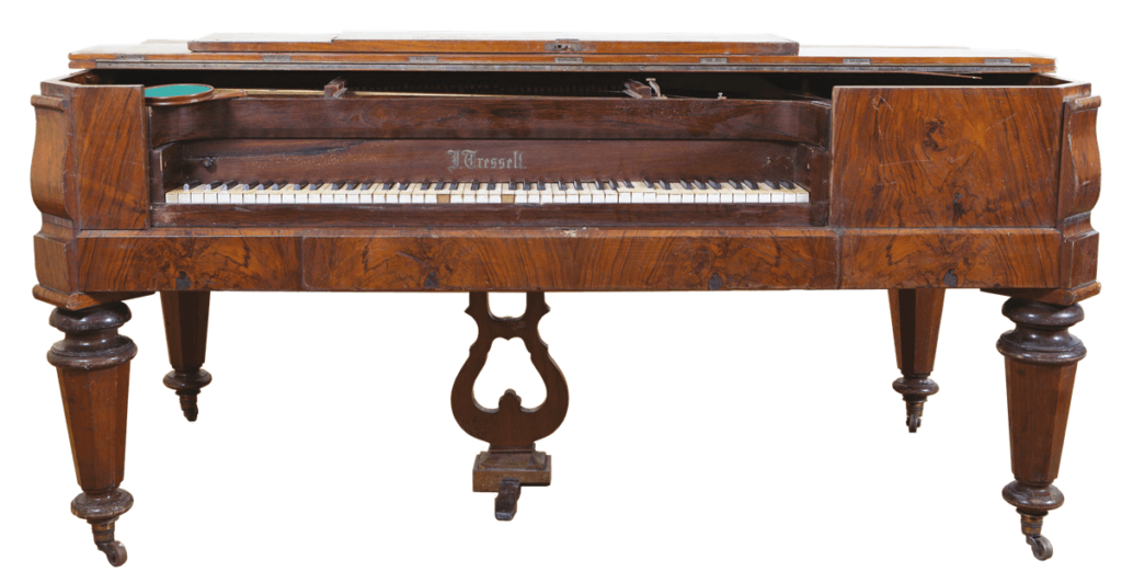fornirowany orzechem; nogi 8-kątne, zawieszenie pedału w kształcie liry, pulpit ramkowy, okleina klawiatury – kość słoniowa, heban / czarno barwione drewno.