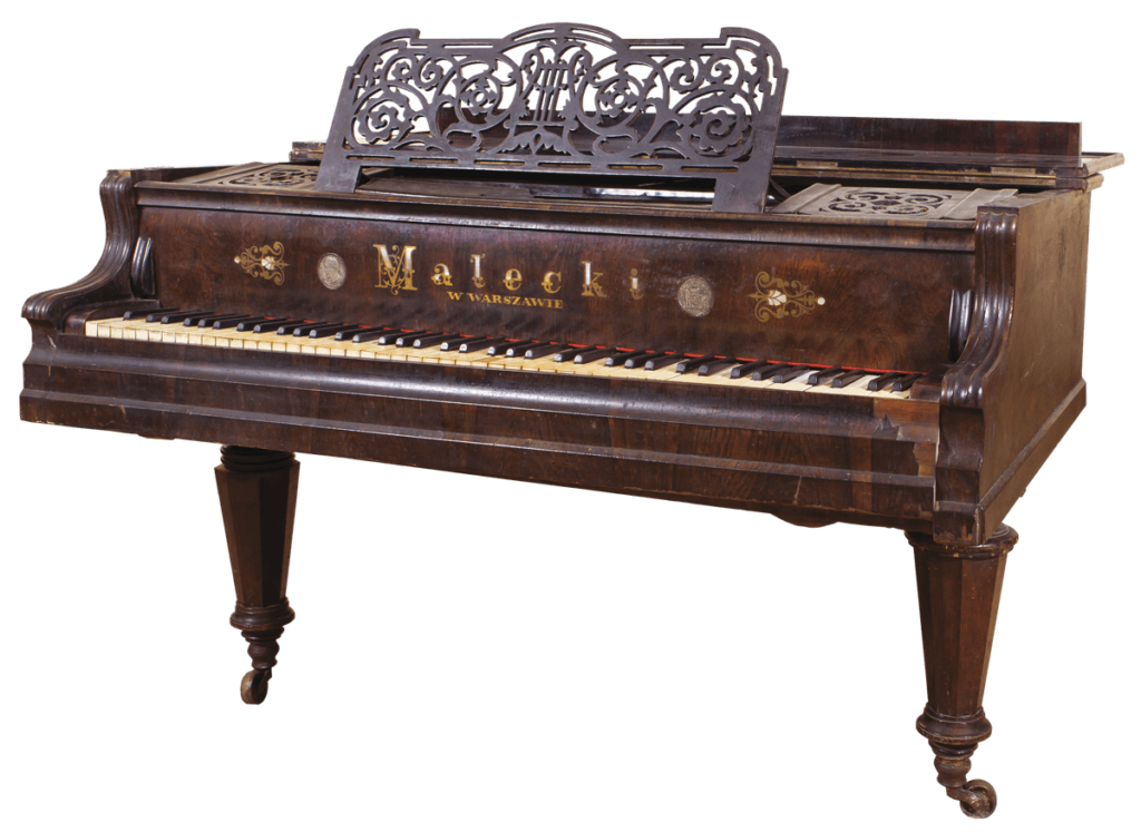na pokrywie klawiatury inkrustowany mosiądzem i masą perłową, ozdobiony ornamentem roślinnym napis: małecki / w warszawie; oraz medalowe plakietki z wystawy paryż 1867, awers z głową cesarza i napisem: napoleon iii empereur / z. münchheimer f. [fecit, – karol zygmunt münchheimer, warszawski medalier], rewers z wizerunkiem orła, wieńca laurowego i amorkami trzymającymi tablicę z napisem: j. małecki, oraz: exposition universelle de mdccclxvii a paris / z. müncheimer f.; na prawym boku od wewnątrz drukowana, papierowa wklejka reklamowa (brak) z wizerunkami medali paryż 1867 i wiedeń 1873: fabryka fortepianów / małeckiego / w warszawie / na sewerynowie no 2779 / przy ulicy aleksandrya; na ramce klinowej klawiatury ołówkiem: 845; na ramie tłumików od spodu ołówkiem: no 875 t [?] w.