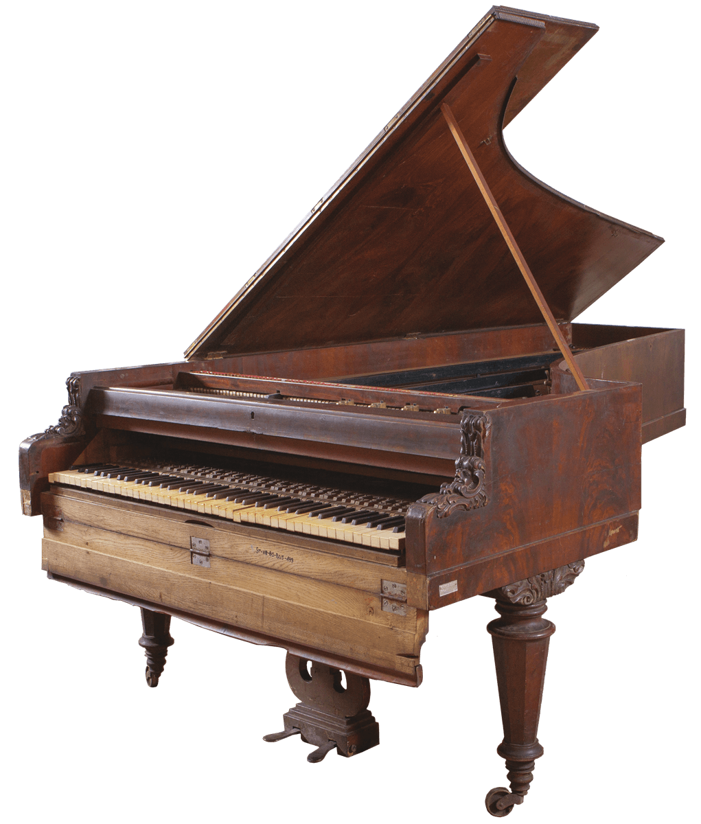 fornirowany palisandrem; nogi 8-kątne, fartuszki nóg rzeźbione w ornament roślinny, zawieszenie pedału w kształcie liry, pulpit ramkowy, krawędzie pokrywy skrzyni rzeźbione w „morską wodę”, krawędzie boczków rzeźbione w liść akantu i ludzkie maski, okleina klawiatury – kość słoniowa, półtony hebanowe.